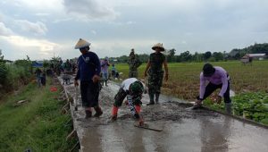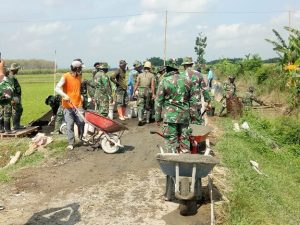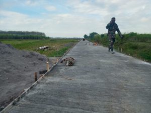 Kejar Target Rabat Beton Jalan, Anggota TNI Ratakan Adonan Cor Dengan Roskam