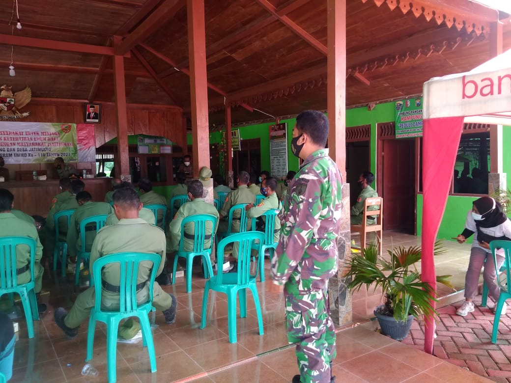 Anggota satgas TMMD ke 110 Kodim 0813 Bojonegoro Serda Sugianto melaksanakan penertiban dalam kegiatan anggota Linmas di Balaidesa Ngrancang.
