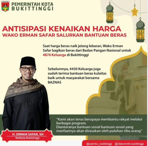 bantuan tersebut di berikan guna membantu warga Bukittinggi kurang mampu yang langsung di terima oleh warga yang telah terdaftar sebaai penerima di Saat harga beras naik jelang lebaran, Walikota membagikan beras dari Badan Pangan Nasional untuk 4876 keluarga di Bukittinggi.