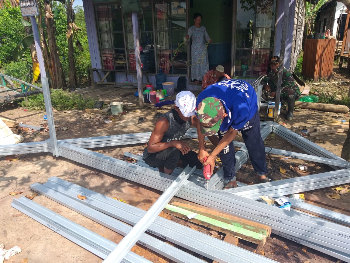 Seperti halnya yang dilakukan saat ini, Sabtu (27/2/21) para anggota TNI dan juga warga Desa Saka Lagun melakukan pemotongan baja ringan yang akan digunakan untuk atap mushola Miftahul Jannah.