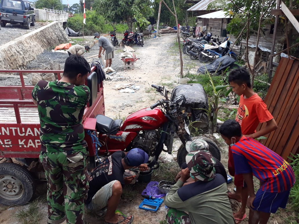 Tampak salah satu Anggota Satgas sedang membantu memperbaiki motor kenderaan warga yang mogok saat melintasi di depan posko satgas TMMD.