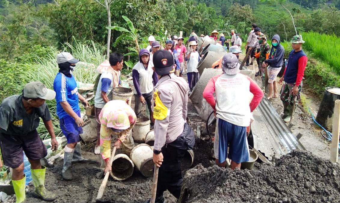 BANYUMAS – Seolah yang ikut punya gawe, sejumlah polisi dari Polsek Pekuncen tetap bertahan ikut kerja di jalan yang merupakan salah satu sasaran fisik TMMD Reguler ke-108 Kodim 0701/ Banyumas, di Desa Petahunan, Kecamatan Pekuncen, Kabupaten Banyumas.
