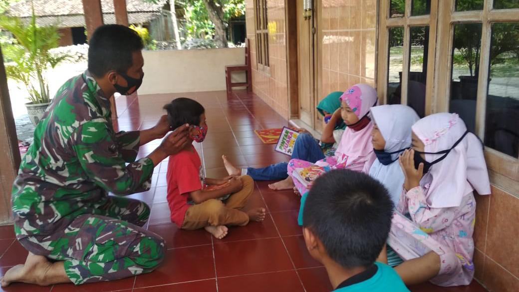 Belajar Bareng Anak-Anak, Satgas TMMD Bojonegoro Ingatkan Pemakaian Masker