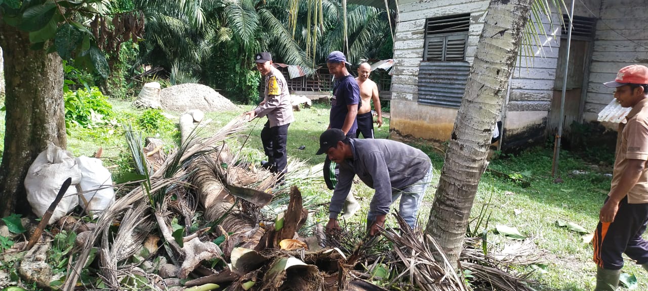 Terkait hal tersebut, Bhabinkamtibmas Polsek Tamiang Hulu Bripka Darwin Syahputra bersama masyarakat setempat dengan sigap melakukan gotong royong membersihkan pohon tumbang tersebut.