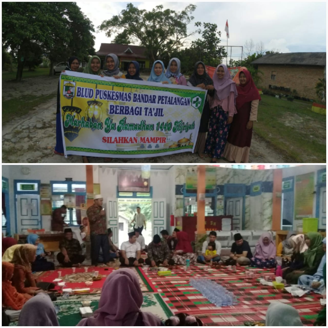 Sebelum acara buka puasa bersama kegiatan di lakukan dengan berbagi takjil di depan Puskesmas yang langsung dibagikan oleh Kepala Puskesmas Rita Widuri, SKM dan tausyiah yang di isi oleh KUA Bandar Petalangan Ahmad Darwis.