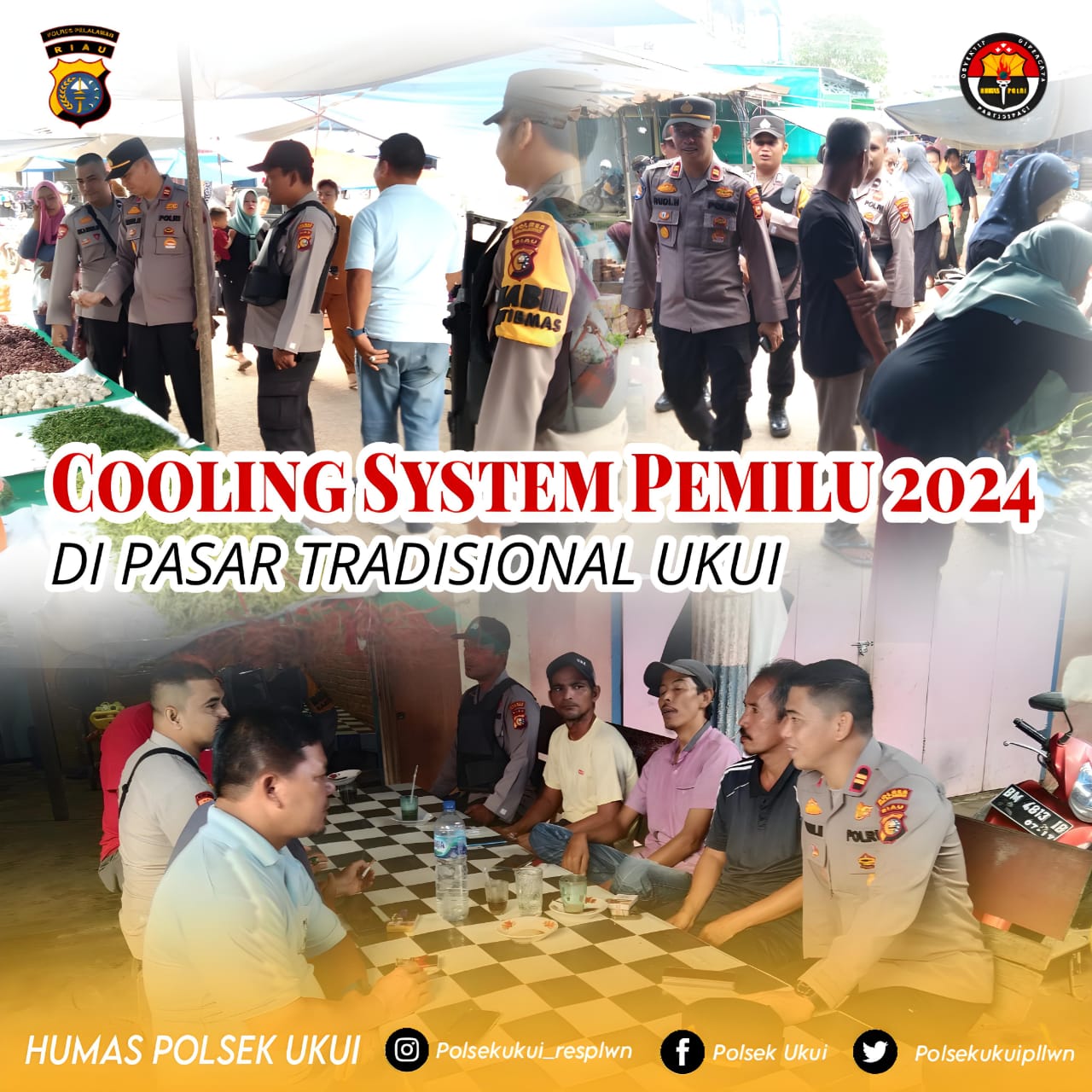 “Bapak-ibu pengunjung/pedagang pasar mohon perhatian sebentar, tak lama lagi kita akan berpartisipasi dalam pemilihan umum, untuk itu kami menghimbau agar selalu menjaga kerukunan, jaga persatuan, ingat kita ini satu negara, satu persaudaraan, hubungan yang sudah terjalin baik jangan sampai terpecah hanya karna perbedaan pandangan politik”. Ujar Kapolsek