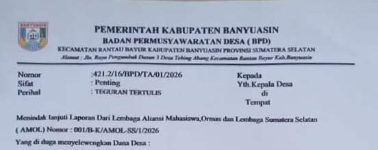Surat teguran yang ditandatangani oleh Ketua BPD Desa Tebing Abang Kecamatan Rantau Bayur Kabupaten Banyuasin Aan Sudiar, memuat beberapa poin pelanggaran serius yang dinilai mengganggu jalannya pemerintahan desa serta merugikan keuangan negara serta tidak Transparan.