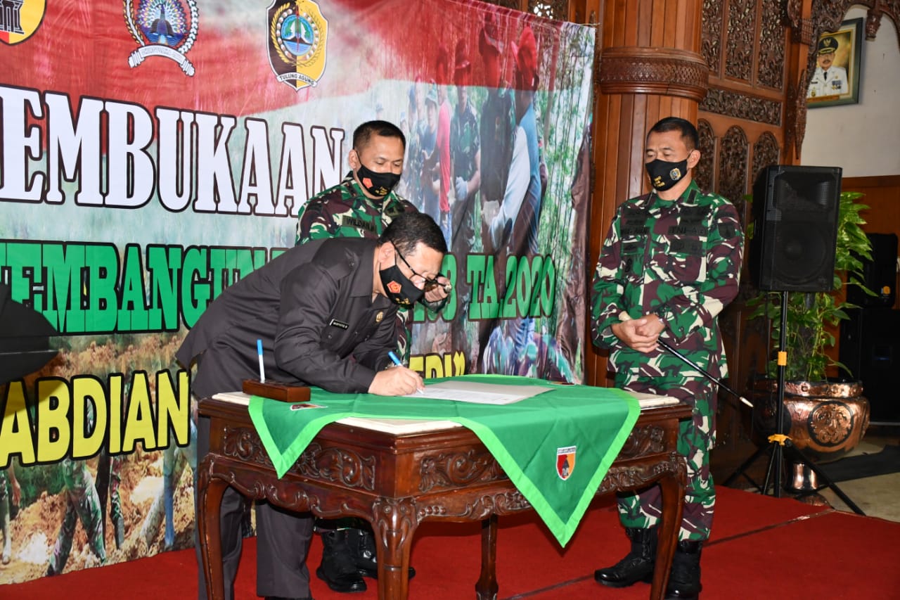 Tulungagung,- Bertempat di Pendopo Kabupaten Tulungagung, hari ini, Selasa (30/6/20) dilaksanakan acara pembukaan TNI Manunggal Membangun Desa (TMMD) Reguler 108 Tahun Anggaran 2020 yang dipimpin langsung oleh Danrem 081/DSJ, Kolonel Inf Waris Ari Nugroho, S.E., M.Si.
