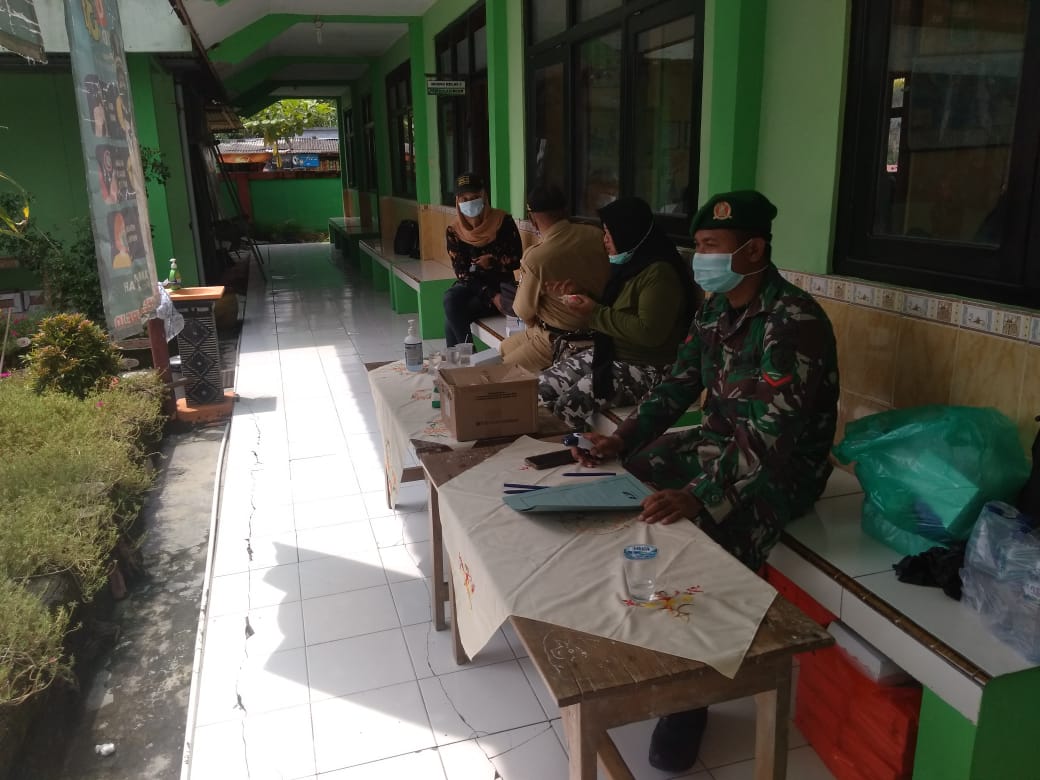 Para anggota satgas TMMD melaksanakan penertiban prokes dalam kegiatan sosialisasi komunikasi informasi dan edukasi PJAS di SD 1 Ngrancang.