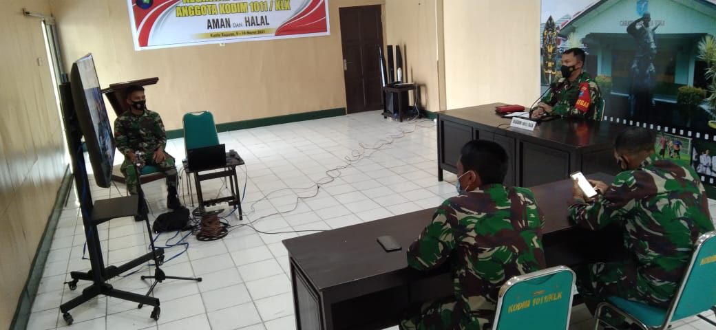 Kapuas,- Didampingi Pasiter Letda Imam Markum, Dandim 1011/KLK, Letkol Inf Ari Bayu Saputro S.Sos, menerima paparan via Vicon dari Asterdam XII/TPR, Kamis (11/3/2021) mengenai jalanya pembangunan fisik dan non fisik dilokasi pelaksanaan TMMD Reguler ke-110, Tahun Anggaran 2021.