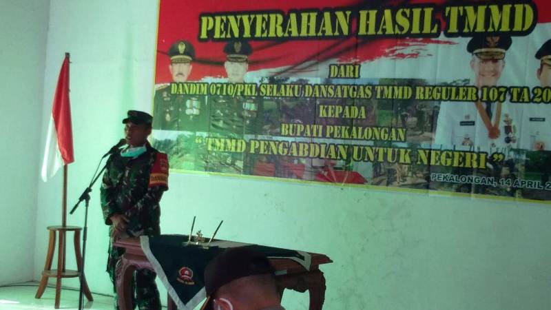 PEKALONGAN, Newshanter.com – Rangkaian acara penutupan TMMD Reguler 107 Kodim 0710 Pekalongan dimulai dari paparan hasil pembanguan dari Dansatgas TMMD Reguler Letkol Infanteri Arfan Johan Wihananto, S.IP, M.M.S, kepada Bupati Pekalongan, H. Asip Kholbihi, SH, M.Si, di Aula Balai Desa Pantirejo, Kecamatan Kesesi, Kabupaten Pekalongan, Jawa Tengah. Selasa (14/4/2020).