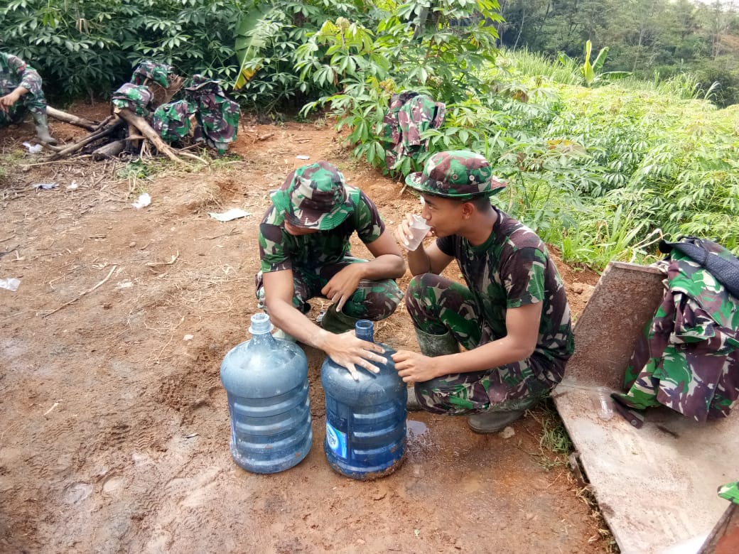 Kudus-Kerja keras Satgas TMMD kali ini membuat keringat anggota terkuras.nampak anggota satgas Pratu Hendra meneguk segelas air demi menghilangkan hausnya di lokasi TMMD Desa Kedungsari Kecamatan Gebog Kudus ini.Kamis 19/3/2020.