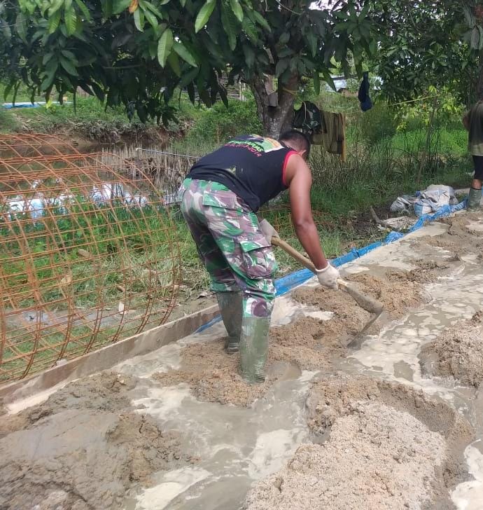 Di antara terik mentari dan kerasnya bebatuan untuk membangun jalan usaha tani, terlihat Serda Jabir mandi keringat mengayunkan cangkul, demi terwujudnya jalan tersebut.