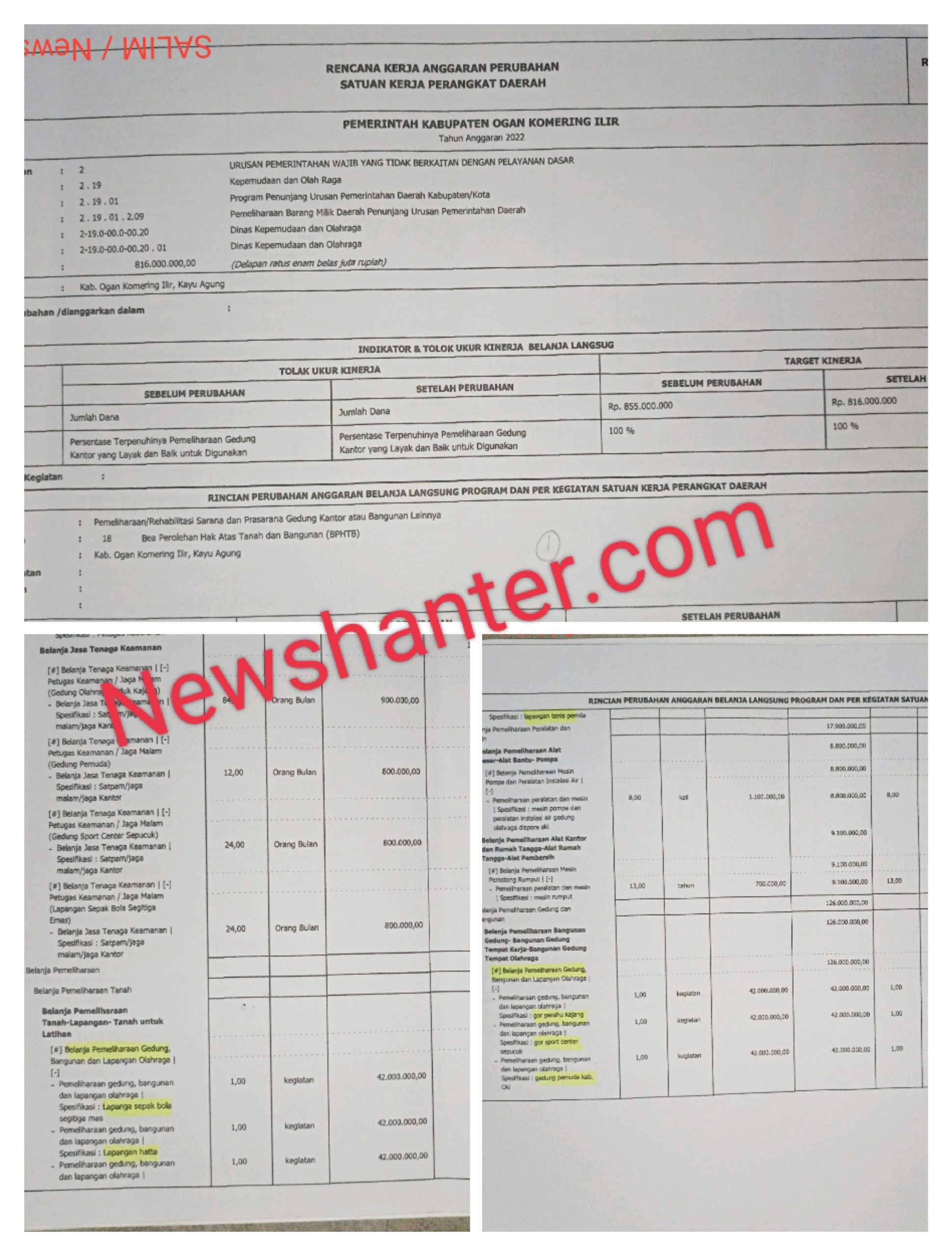 Dan kode rekening 5.1.2.03.03.0011 5.2.1.20.11 Belanja pemeliharaan bangunan gedung-bangunan gedung tempat kerja-bangunan gedung tempat olahraga dengan anggaran Rp.126.000.000 untuk pemeliharaan : (1. Gor Perahu Kajang, 2. Gor Sport Center Sepucuk dan 3. Gedung Pemuda Kab.OKI). Realisasi anggaran sebesar Rp.124.921.825 atau dengan sisa anggaran Rp.1.078.175,-. ( Tahapan pencairan Pertama Rp.31.500.000 + Kedua Rp.93.421.825).