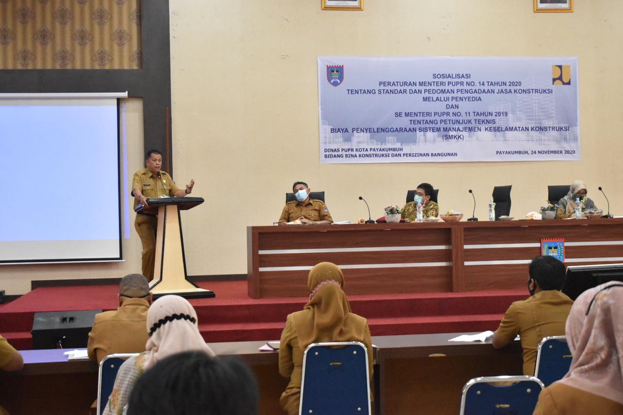 Payakumbuh, NewsHanter.com — Dinas Pekerjaan Umum dan Penataan Ruang (PUPR) Kota Payakumbuh Sosialisasikan Peraturan Menteri (Permen) PUPR Nomor 14 Tahun 2020 serta Surat Edaran (SE) Menteri PUPR Nomor 21 Tahun 2019 kepada Pejabat Pengadaan, PPTK dan PPK dari Organisai Perangkat Daerah (OPD) pelaksana kegiatan konstruksi di lingkungan Pemerintah Kota (Pemko) Payakumbuh.