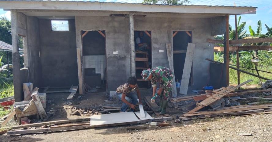 Dibantu dengan warga banunan ini sudah mencapai target 70%, dinding dan atap bangunan sudah terpasang dan untuk tahap selanjutnya satgas TMMD Kodim 1004/kota baru akan memasang keramik dinding bagian dalam bangunan.