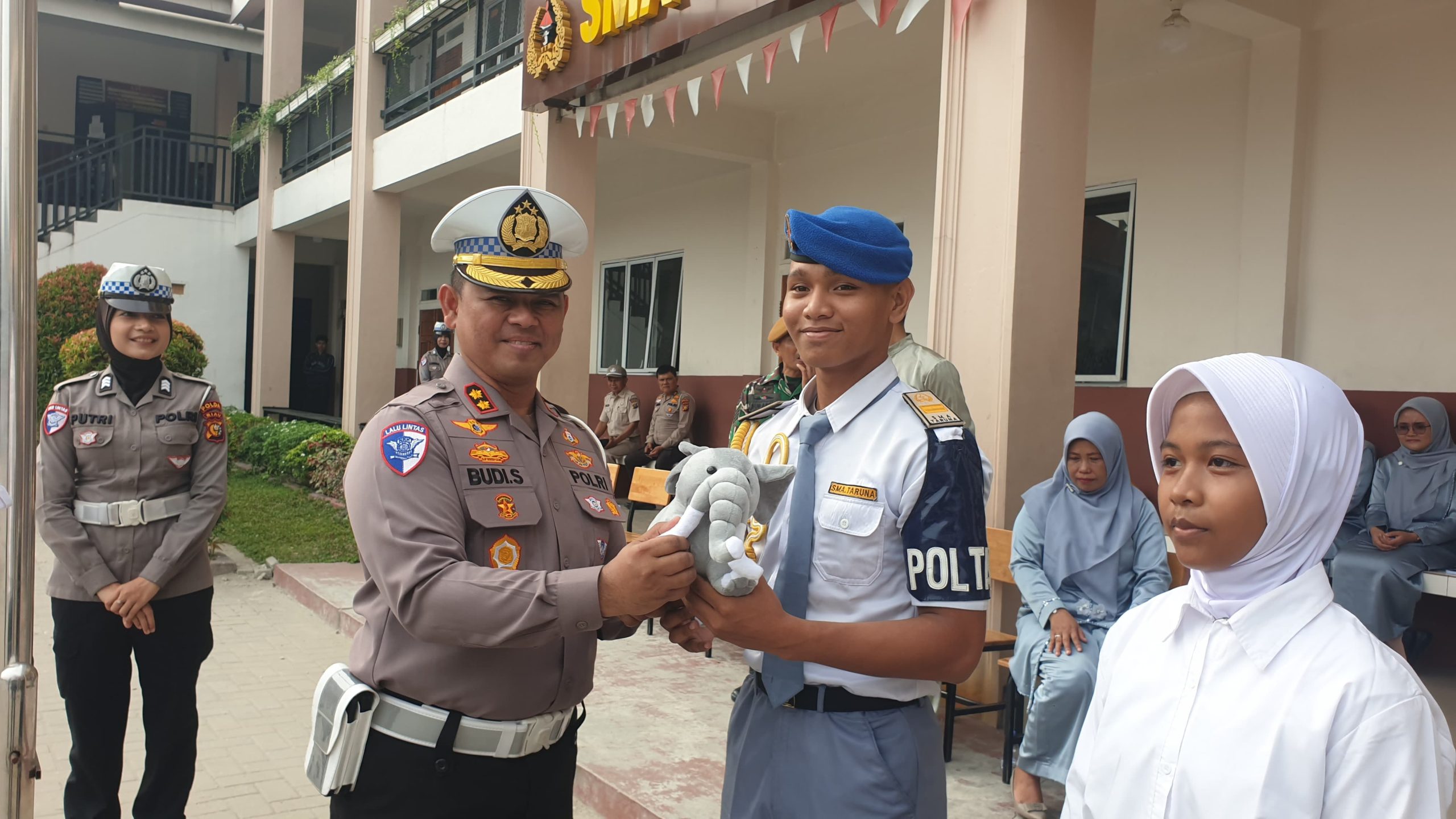 Turut hadir Kasubdit Kamsel Ditlantas AKBP Dasril, S.Pd., M.M., Ps. Kasijemenopsrek Subdit Kamsel Ditlantas AKP Jalinus, Ps. Kasi Audit dan Inspeksi Subdit Kamsel Ditlantas AKP Dedi Siswanto, S.H., M.H., Kanit Sijemenopsresk Subdit Kamsel Ditlantas AKP Jajang Sobar, Ps. Kanit Dikmas Subdit Kamsel Ditlantas IPDA Roni Bandriono, Personel Ditlantas Polda Riau, Kepala Sekolah dan para Majelis Guru SMA Taruna Mandiri Pekanbaru.