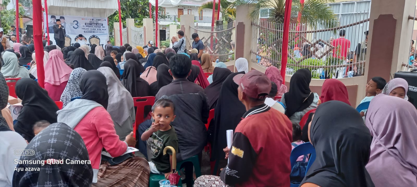 Selanjutnya Erman Safar menyampaikan beberapa hal isyu politik,”kita kerjanya hanya membantu orang, apakah bapak bapak dan ibuk ibuk lebih suka pemimpin yang menolong atau mengganggu”, tanya bang wako, dan di jawab ” Menolong “, ujar masyarakat serempak,jadi pemerintah harus hadir menolong masyarakat,ucapnya.