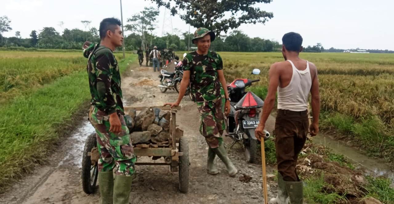PEKALONGAN, Newshanter- Gerobak kayu usang, pinjaman dari warga lagi. Namun alat bantu itu benar-benar setia menemani para anggota Satgas TMMD TMMD Reguler ke-107 Kodim 0710/Pekalongan, untuk merampungkan pembangunan talud di Dukuh Jlubang Desa Pantirejo, Kecamatan Kesesi, Kabupaten Pekalongan, Jawa Tengah.