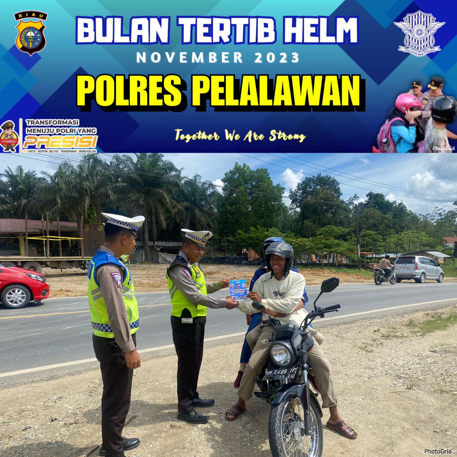 Giat Preventif tersebut, dengan membagikan Brosur dan Stiker Bulan Tertib Helm di Jalan Lintas Timur KM 111 Kecamatan Pangkalan Kuras, Kabupaten Pelalawan, Jumat (1/12/2023).