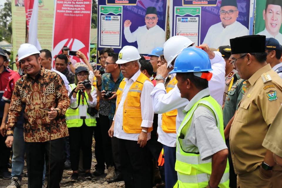 Muara Enim. Newshanter.com.Menteri Pekerjaan Umum Perumahan Rakyat (PUPR) Republik Indonesia DR. Ir. Mochamad Basuki Hadimuljono, M.Sc dan Menteri Perhubungan Republik Indonesia Ir. Budi Karya Sumadi didampingi Gubernur Sumatera Selatan H. Herman Deru, S.H., M.M, Anggota DPR-RI Sumatera Selatan Wahyu Sanjaya, Bupati Muaraenim Ir. H. Ahmad Yani, MM, Wakil Bupati Muaraenim H. Juarsah, SH, Direktur PT. Hutama Karya (HK), melakukan ground breaking peletakan batu pertama pembangunan jalan tol Muaraenim-Indralaya 119 , Muaraenim-Lubuk Linggau 114, bertempat di Simpang 4 Desa Kepur Kabupaten Muaraenim, Selasa (09/04/2019).