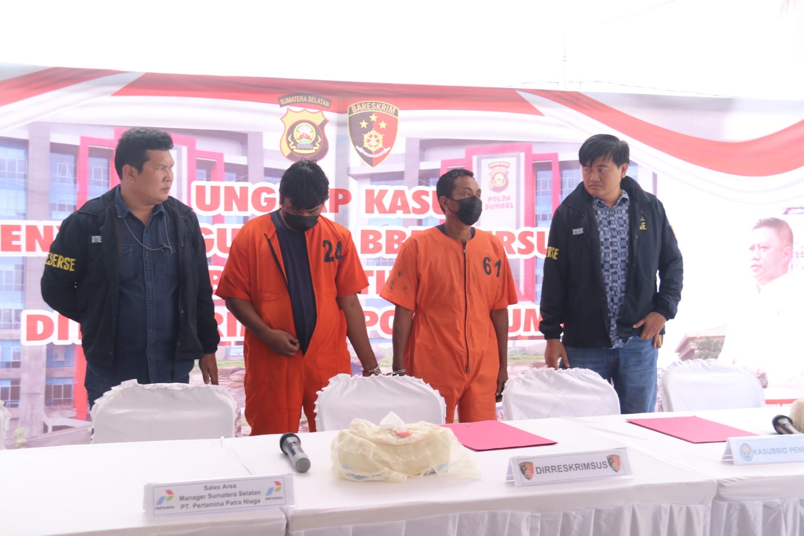 Direktur Reserse Kriminal Khusus Polda Sumsel Kombes Pol Bugus Suropratomo Oktobrianto didampingi Plt Kasubbid Penmas Kompol Menang,SH., MSi mengatakan pihaknya menangkap dua orang pelaku sopir mobil box yang melakukan pengisian solar subsidi dengan barcode MyPertamina untuk pembelian BBM subsidi jenis solar secara ilegal.