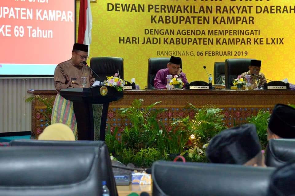 Bangkinang Kota, newshanter.com – Plt Bupati Kampar Catur Sugeng Susanto SH menyampaikan berbagai kemajuan pembangunan Kabupaten Kampar pada acara Sidang Paripurna Istimewa tentang Hari Jadi ke-69 Kabupaten Kampar di ruang Paripurna DPRD Kabupaten Kampar. Rabu,6/2