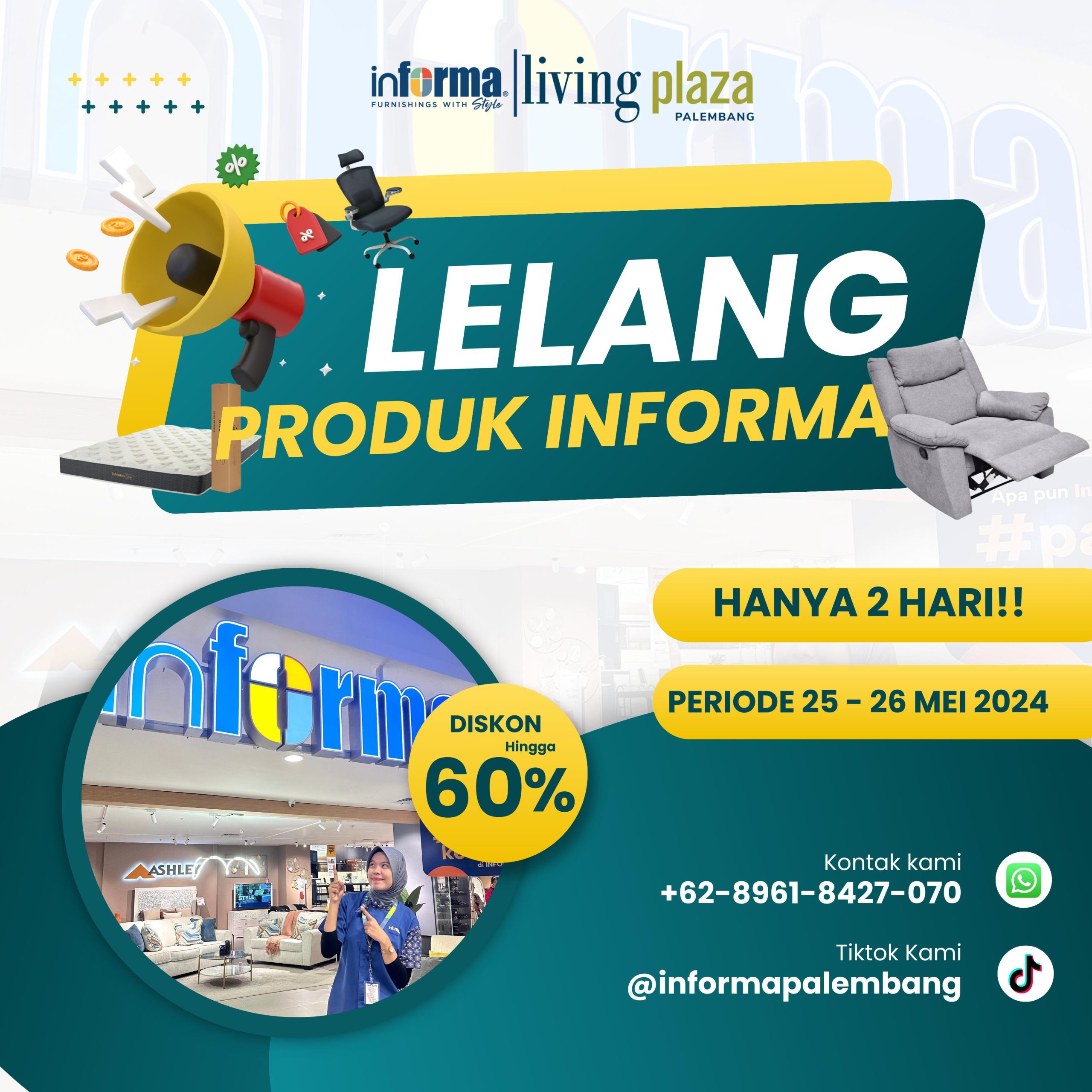 Sobat Informa bisa langsung datang ke store Informa Living Plaza Palembang yang ada di Ex Gedung Ramayana dalam 2 Hari ini, karna periode promo hingga 25 – 26 Mei 2024.