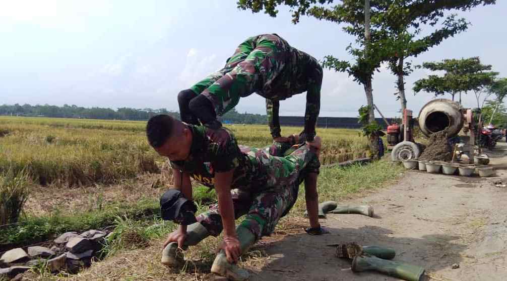Disela-sela istirahatnya beberapa anggota Satgas TMMD menggelar atraksi sekaligus untuk sarana olah raga dalam rangka jaga stamina. Sedikitnya tiga orang anggota Satgas, menggelar gerakan bertumpuk tidak jauh dari lokasi pekerjaan TMMD.