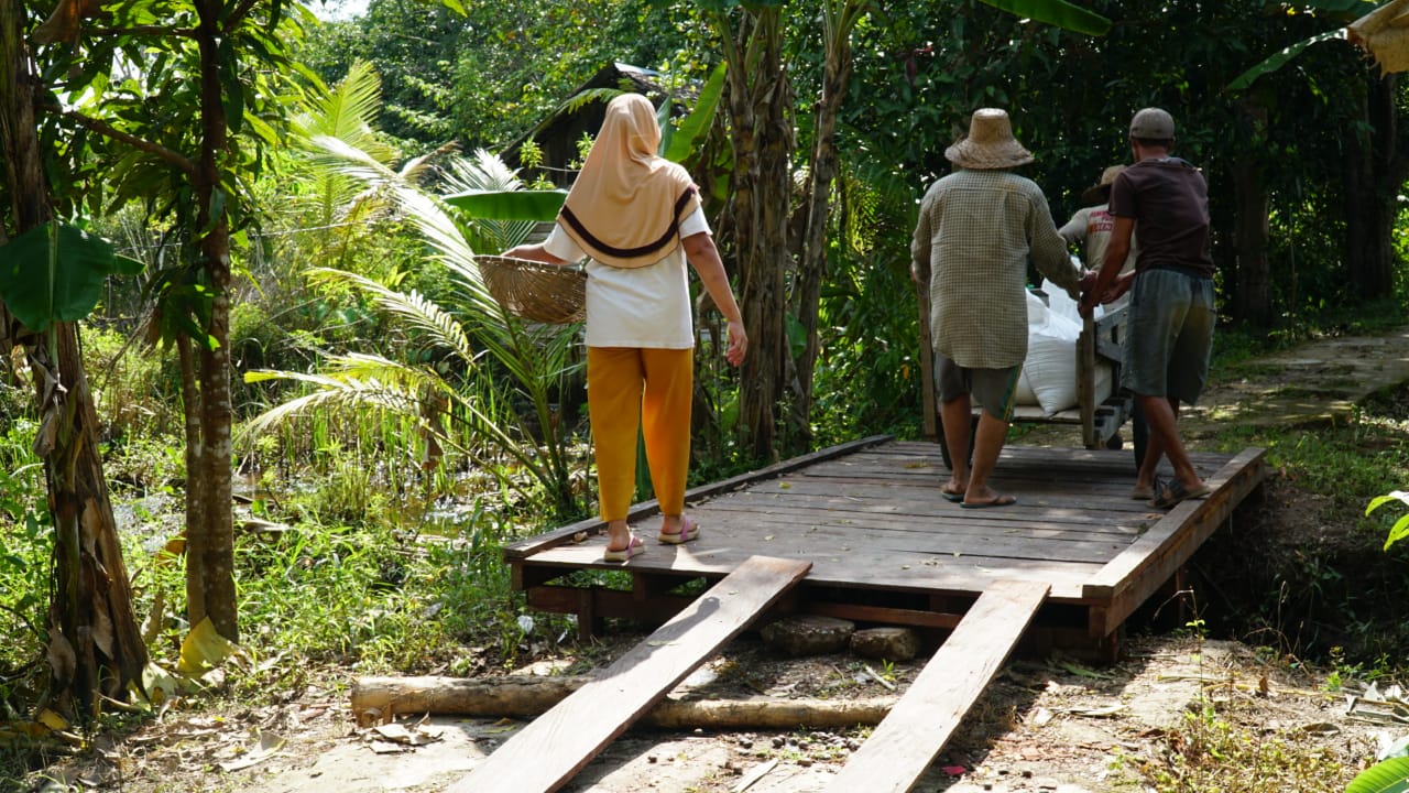 Seperti yang dikerjakan Murjani, Supyani dan Bahrianur pagi ini, Senin (1/3/21) mereka memanfaatkan jembatan lama yang digunakan dalam kesehari-hariannya menuju ke ladang. Mereka nampak membawa pupuk untuk memupuk tanamannya.