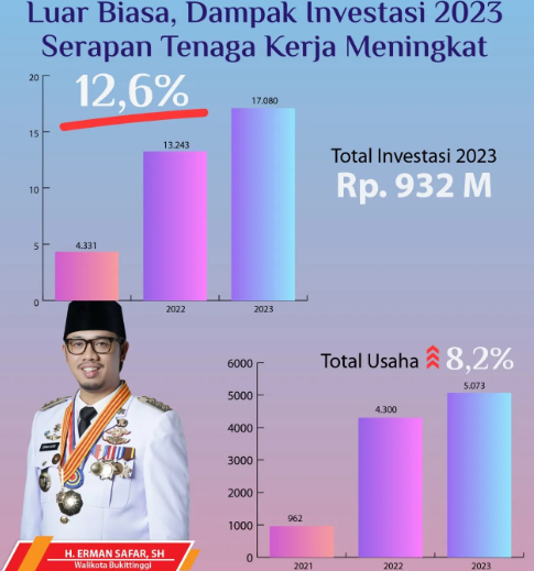 Bukittinggi, News Hanter.Com- Pencapaian yang Luar Biasa, Selama tahun 2023, sebanyak 4339 kegiatan usaha tumbuh, dengan pencapian yang sebanyak itu bisa menyerap 17.081 Tenaga Kerja di Bukittinggi, dengan total investasi 932Milyar
