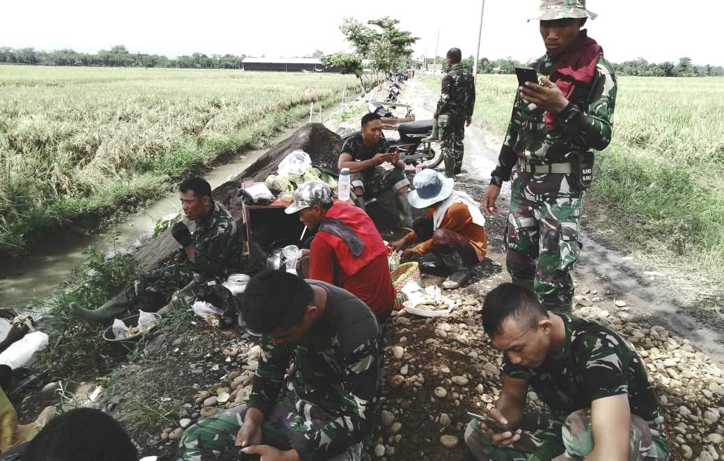 Lain halnya yang dilakukan Pratu Supardi, anggota Satgas TMMD yang sama-sama dari Batalyon Inf. 405/Surya Kusuma. Dia memanfaatkan waktu istirahat kerja untuk ngobrol dengan warga, sambil menikmati kopi panas dan jajanan.