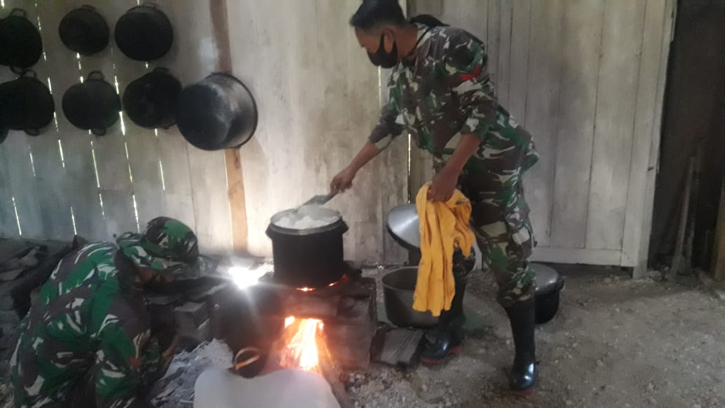 Bojonegoro – Anggota Satgas TMMD ke-110 Kodim 0813/Bojonegoro membantu ibu Leni dalam mempersiapkan makan siang untuk Panitia dan Peserta Bimtek pengolahan produk ternak.