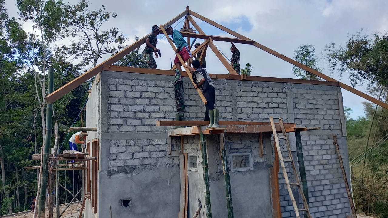 Dalam pemasangan tersebut, tukang kayu, warga dan juga satgas TMMD ikut naik ke atas untuk mengangat kuda kuda dari bawah sekaligus menata pada tempatnya dengan menggunakan kayu dan tali karena dalam pekerjaan ini harus memerlukan kehati-hatian karena yang dipasang merupakan kayu dengan beban yang berat maka memerlukan kekompakan.