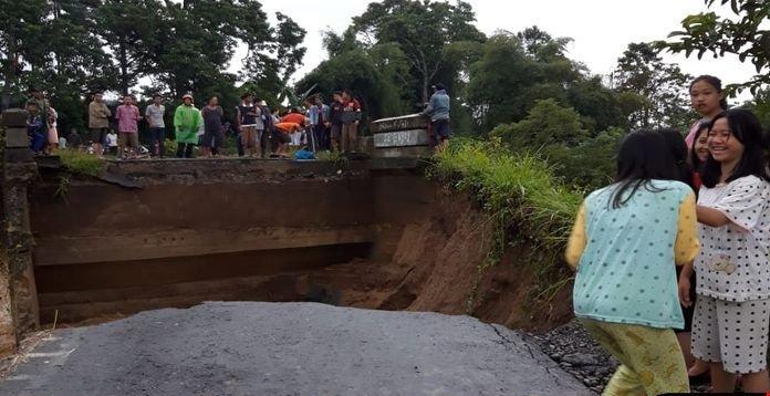 ” Hujan deras dari jumat pagi kemarin, jadi air sungai meluap hingga memutuskan jalan jembatan,” Kata Jumali.