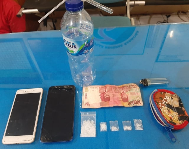 Kemudian petugas lasung mengamankan kedua tersangka. Ketika dilakukan penggeledahan terhadap mereka dan petugas menemukan barang bukti narkotika jenis shabu di dalam kantong celana tersangka yang di masukan kedalam dompet berisi 5 lima paket Narkoba jenis shabu yang di bungkus dengan plastik bening