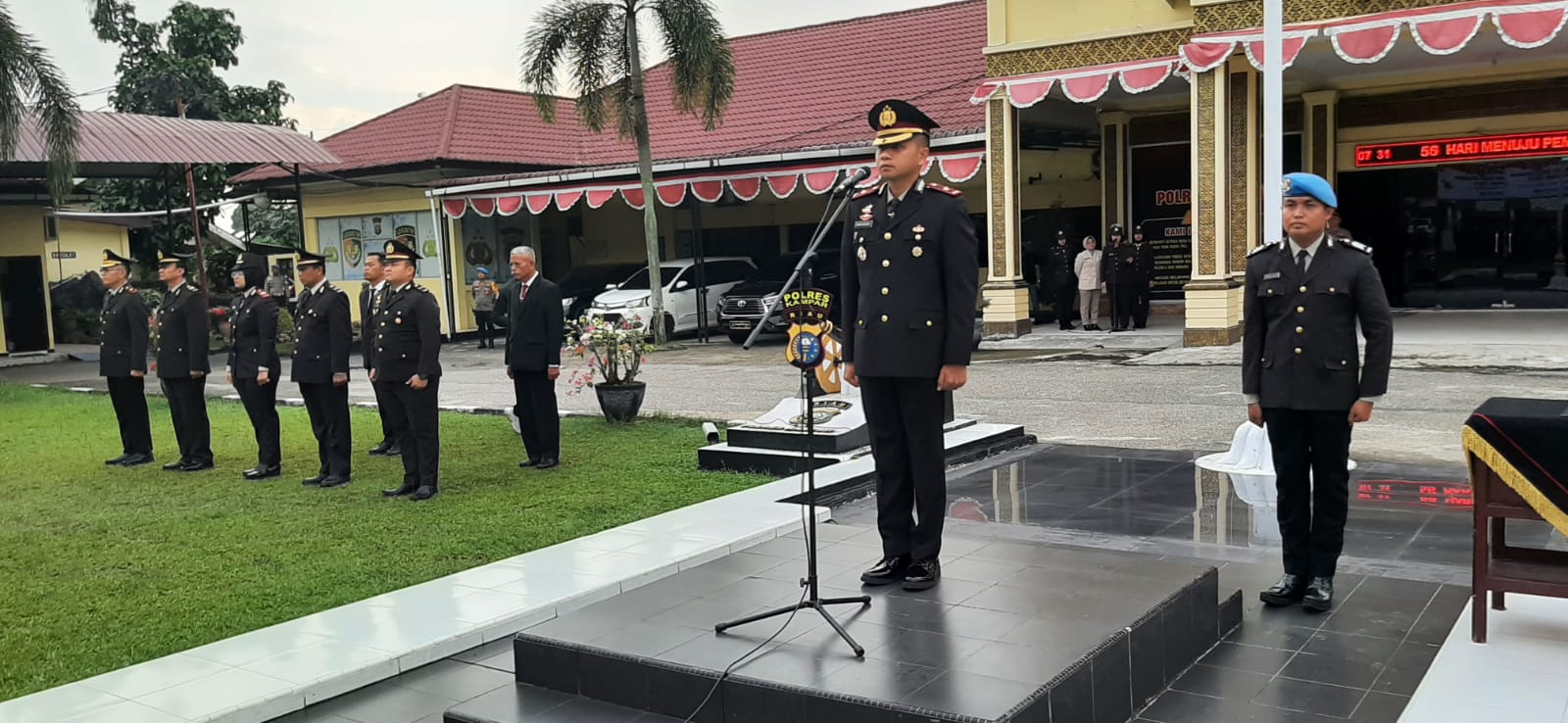 Bertindak selaku Inspektur Upacara Kapolres Kampar AKBP Ronald Sumaja yang di wakili Waka Polres Kampar Kompol Andi Cakra Putra, Perwira upacara Kasat Binmas AKP Era Maifo dan Komandan upacara IPDA Ashari Antoni.