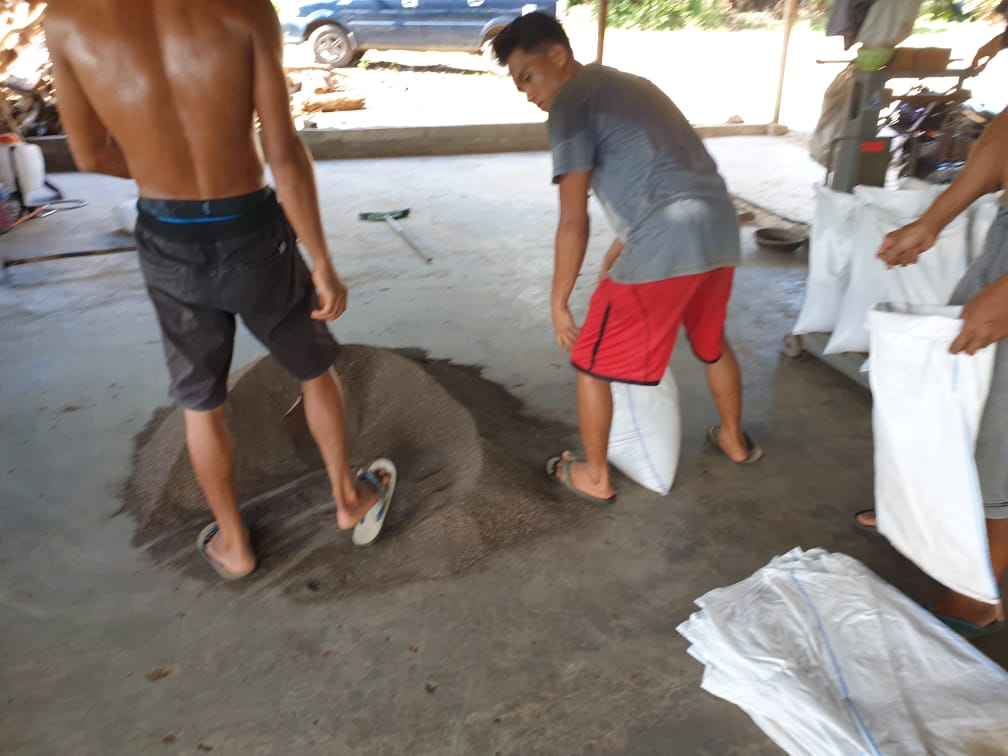 Beberapa pekerja terlihat sedang loading memasukkan timah yang sudah digoreng ke dalam karung dan kemudian diangkut mobil Hilux. Sebagian pegawai lainnya sedang menggoreng dan terlihat banyak tumpukan tailing di dalam karung.