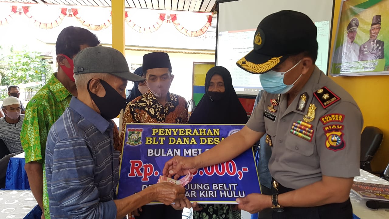 Pendistribusian bantuan ini diawali penyerahan secara simbolis dana BLT-DD Desa Tanjung Belit untuk bulan April dan Mei 2020 oleh Camat Kampar Kiri Hulu dan Kapolsek Kampar Kiri, kepada 2 orang perwakilan masyarakat penerima BLT-DD.
