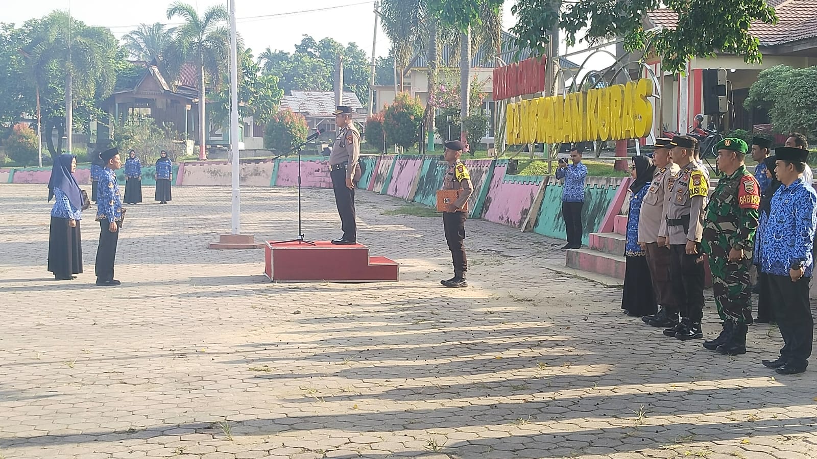 Diikuti oleh para Perwira Polsek Pangkalan Kuras, Kasi, Kabid, Korwil dilingkungan Kecamatan Pangkalan Kuras, KA Puskesmas Pangkalan Kuras I dan II , Lurah Sorek Satu dan para peserta upacara yang terdiri dari Pleton Polri, Pleton Damkar dan Satpol PP, Pleton ASN dan Honorer dilingkungan Kecamatan dan Pleton Pelajar SDN, SMP dan SMA di Kecamatan Pangkalan Kuras.
