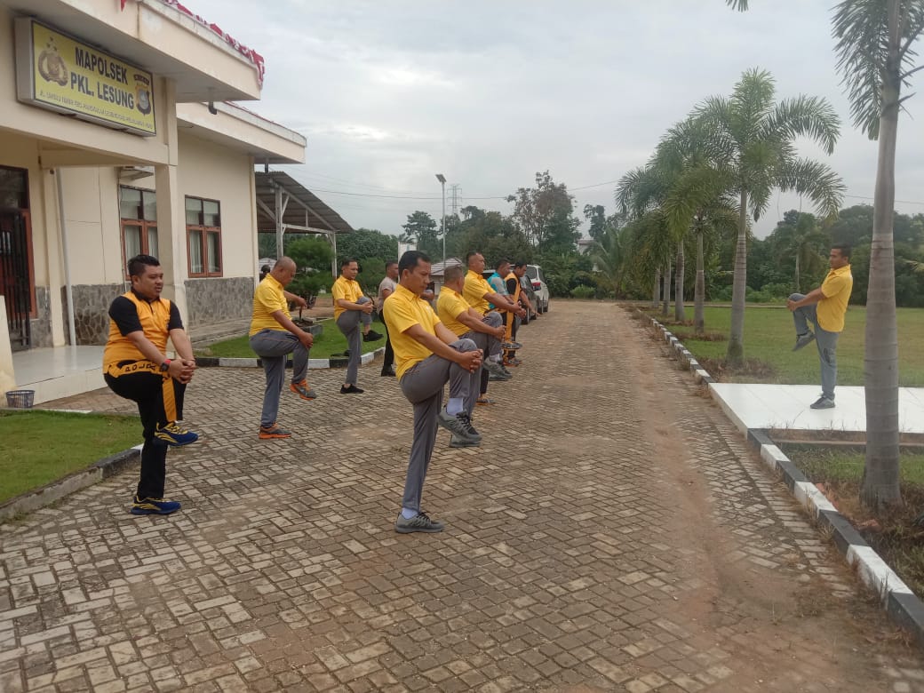 PELALAWAN, NEWSHANTER.COM-Kapolsek Pangkalan Lesung AKP Liston Sihombing SH, MH bersama seluruh personil Polsek Pangkalan Lesung melaksanakan olah raga bersama, Sabtu (9/57/2022) pagi.