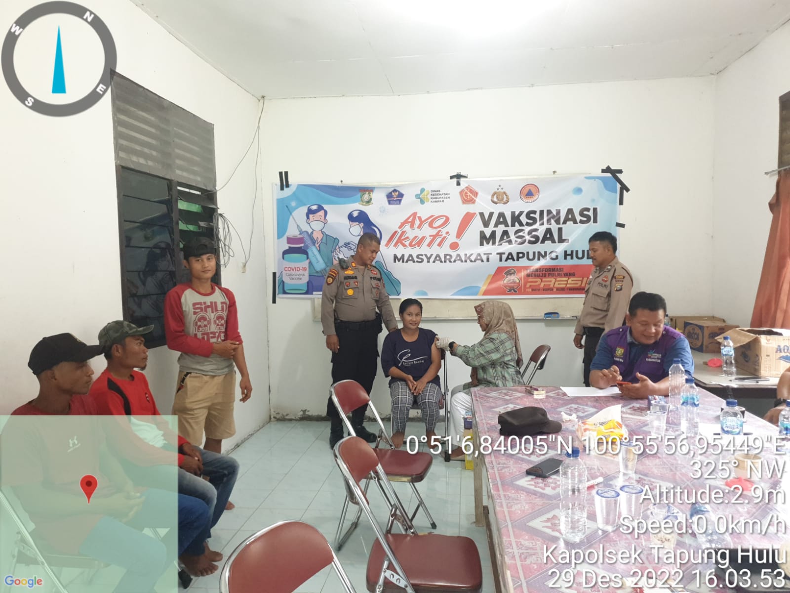 Kampar,newshanter.com – Kapolsek Tapung Hulu, AKP Nurman, SH, MH turun langsung memantau dan mengamankan kegiatan vaksinasi terhadap pra lansia, lansia, masyarakat umum, remaja, ODGJ, dan tenaga kesehatan oleh Puskesmas Sukaramai dan Puskesmas Senama Nenek Kecamatan Tapung Hulu, Kamis (29/12/22).