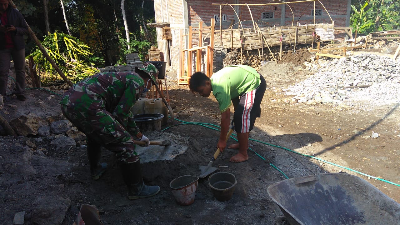 Tulungagung,- Merasa dirinya mendapatkan bantuan program bedah rumah tidak layak huni menjadi rumah layak huni dalam program TNI Manunggal Membangun Desa 108, Tahun anggaran 2020, Karyono (43) warga rt1/rw 2 dusun Ngasem Desa Ngepoh Kec. Tanggunggunung dengan kerja keras ia membantu Satgas dalam mengaduk semen.