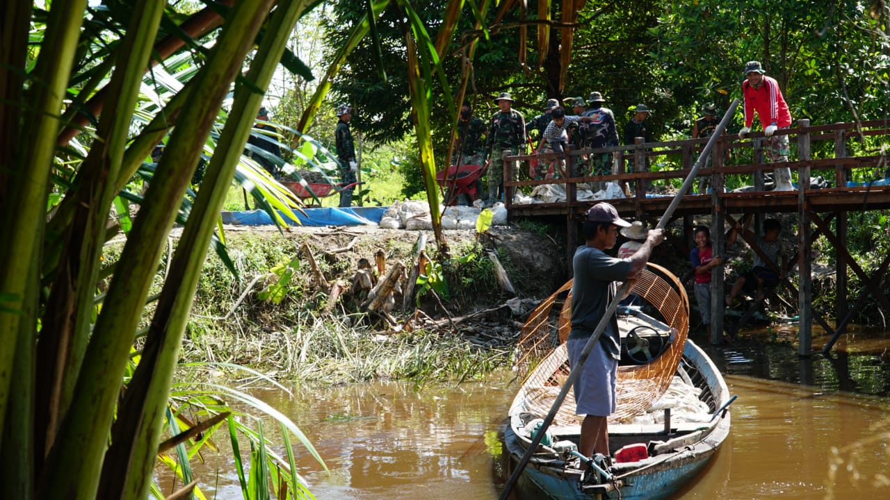 Kapuas,- Dengan penuh semangat Satuan Tugas (Satgas), TNI Manunggal Membangun Desa (TMMD), ke 110, Kodim 1011/KLK, di Desa Saka Lagun, Kecamatan Pulau Petak, Kabupaten Kapuas, mengangkat anyaman besi untuk dibawa ke lokasi pembangunan jalan usaha tani dengan menggunakan perahu kayu Kamis (18/3/2021).