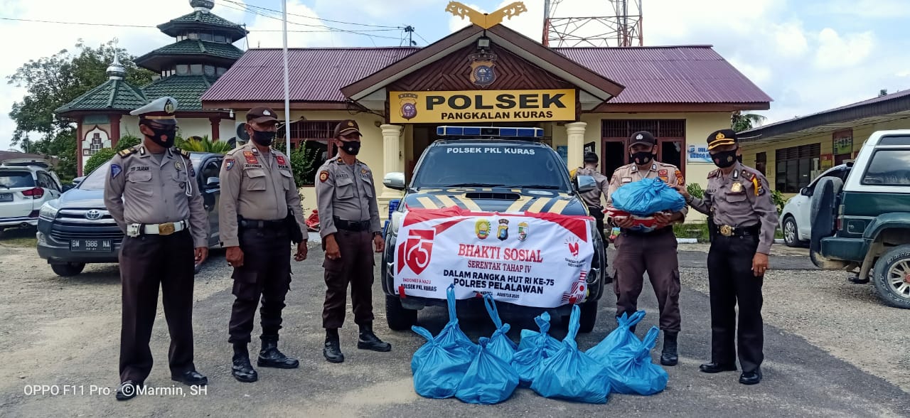 PELALAWAN,NEWSHANTER com – Polsek Pangkalan Kuras Kabupaten Pelalawan melakukan kegiatan Bansos dalam rangka Hari Ulang Tahun Republik Indonesia Ke-75 Tahun 2020 dengan membagikan sembako kepada warga di kecamatan Pangkalan Kuras, Rabu (19/8/20).