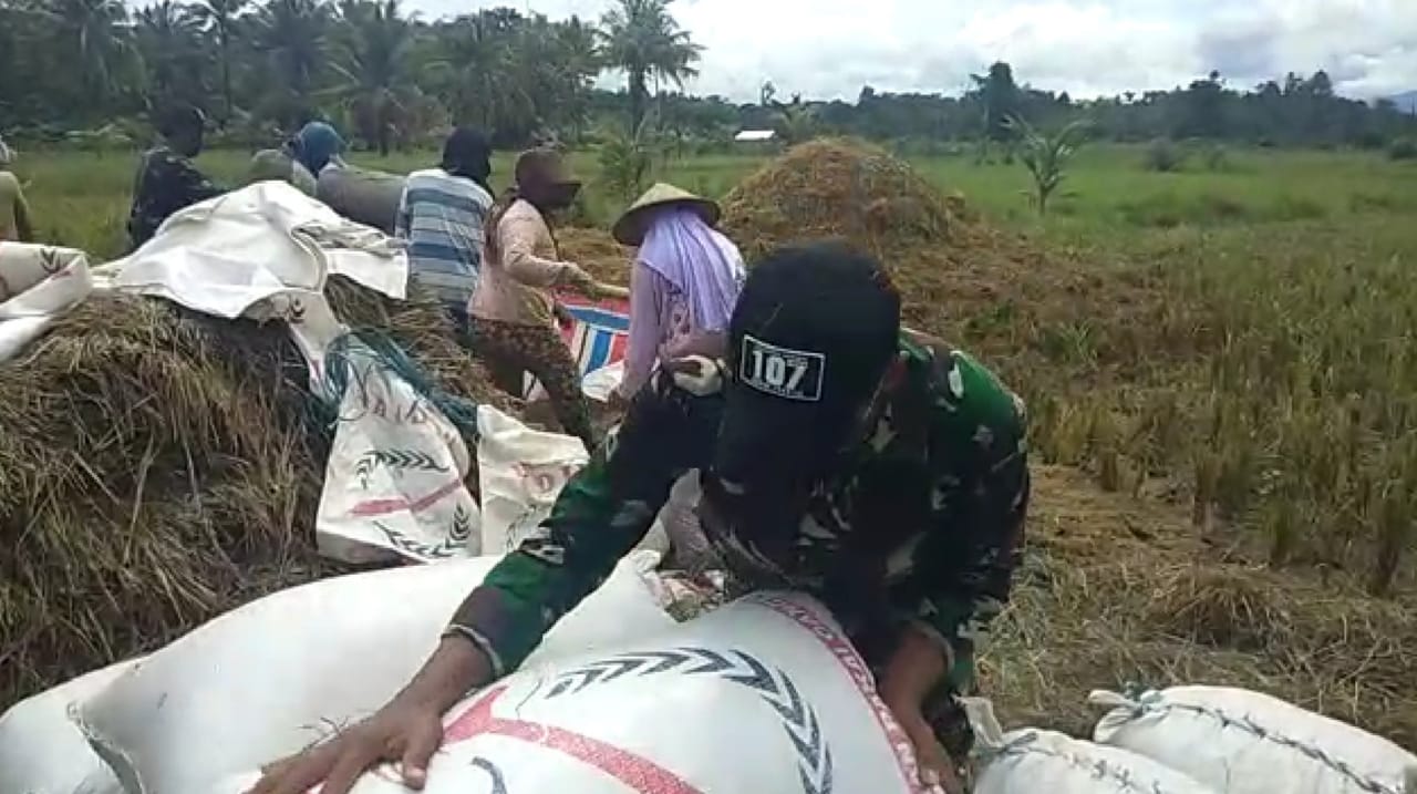Banggai,- Serma Hariyono, anggota Satgas TMMD 107 Kodim 1308/LB, Minggu (12/4/20) membantu warga desa Argakencana dalam memanen padi di sawah.