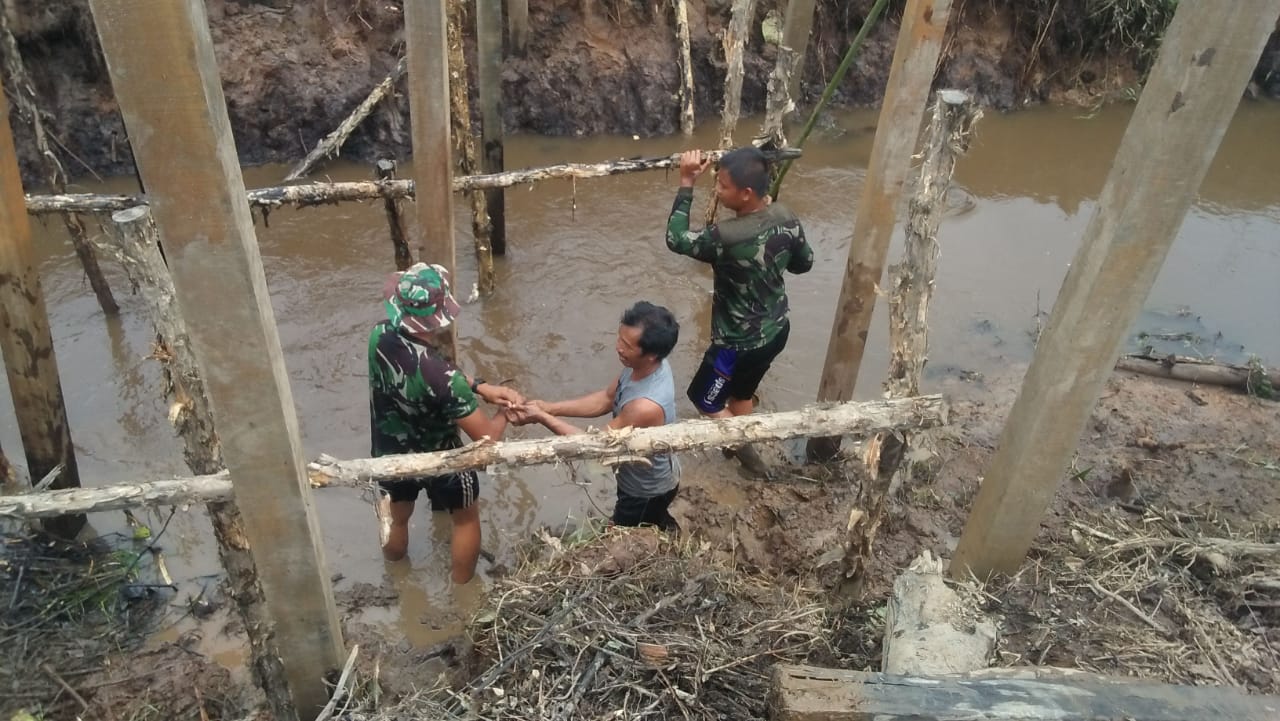 Kapuas,-Personil TNI dari Kodim 1011/ KLK Kapuas Yaitu Pratu Gunawan dan Pratu Roni, terus bekerja untuk pembuatan Jembatan. Tiang Pancang sudah dipasang begitu rapi, kini kedua personil bersama anggota lainya serta warga membuat andang untuk pemasangan balok kayu.