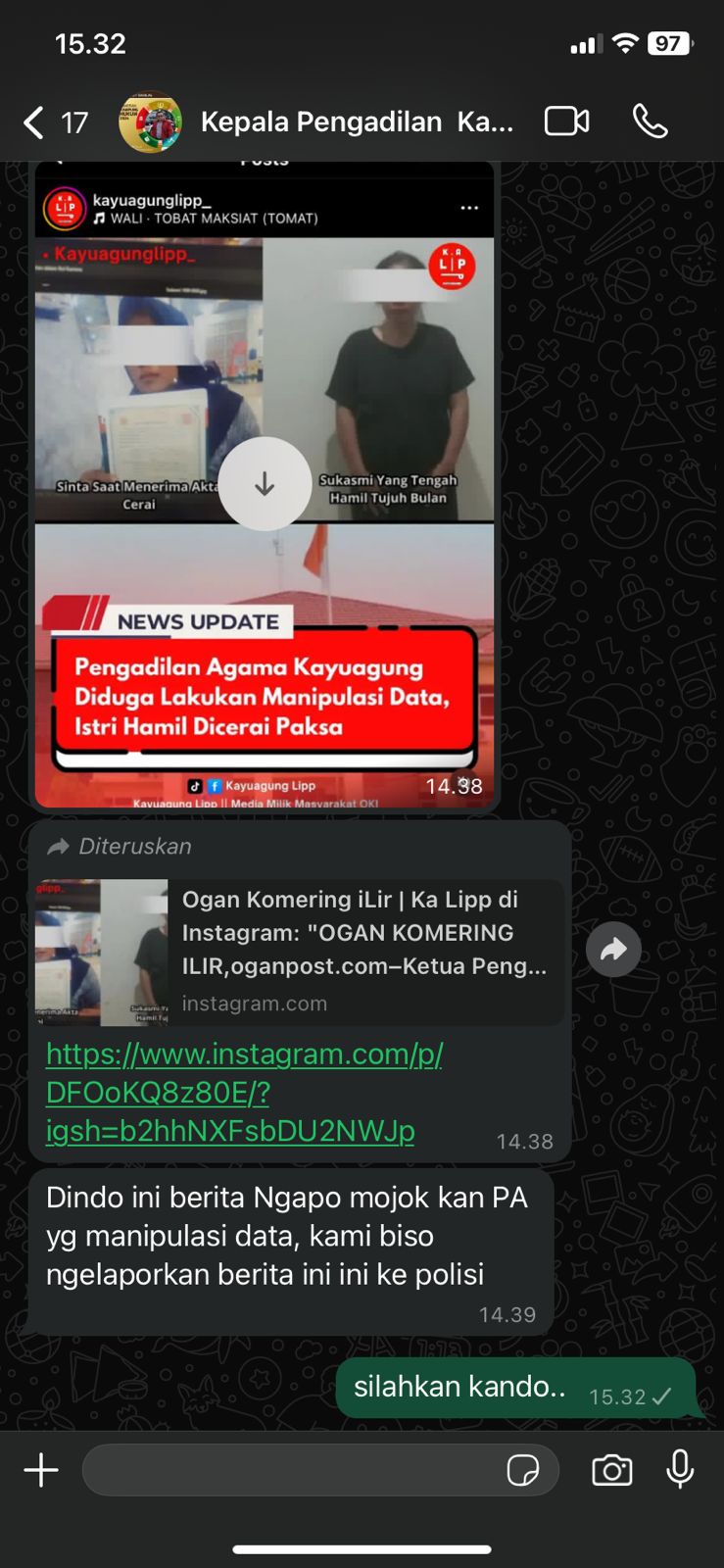OKI, newshanter. com – Ketua Pengadilan Agama Kayuagung, Korik Septian, S.Ag., M.Ag., dikabarkan mengancam akan melaporkan seorang wartawan ke polisi. Ancaman ini diduga disampaikan melalui percakapan pribadi dengan Rio Hakan Sukur, wartawan Ogan Post. Persoalan bermula dari pemberitaan yang menyoroti dugaan ketidakadilan dalam putusan perkara, salah satunya dengan judul berita: Pengadilan Agama Diduga Lakukan Manipulasi Data, Istri Hamil Dicerai Paksa.
