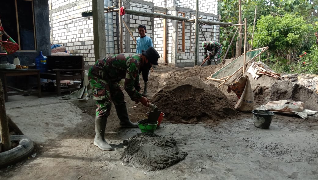 Salah satu anggota satgas TMMD tersebut adalah Koptu Priyono yang terlihat mahir dalam aduk mengaduk adonan pasir bercampur dengan semen direhab Rumah Tidak Layak Huni (RTLH) milik Mudadi (66) warga Dusun Pandahan Rt.01 Rw.02 Desa Tamansari yang menerima bantuan rehab RTLH di program TMMD. Rabu (30/6/2021)