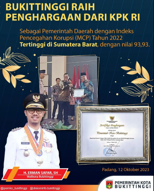 Direktorat Korsub wilayah I Sumatra Barat berikan penghargaan MCP 2022, pada pemerintah daerah yang berkomitmen melakukan upaya pencegahan korupsi dan Upaya ini sesuai dengan komitmen Wali Kota Bukittinggi, Erman Safar, agar seluruh ASN di Lingkungan Pemko Bukittinggi bekerja dengan maksimal sesuai aturan yang berlaku. Setiap pegawai terutama pejabat pemerintah, harus paham dan menerapkan prinsip prinsip anti korupsi dalam menjalankan tata kelola pemerintahan. Hal ini membuat Bukittinggi menjadi kota dengan peringkat pertama atas capaian indeks pencegahan korupsi tertinggi di Sumatra Barat dengan nilai 93,93.